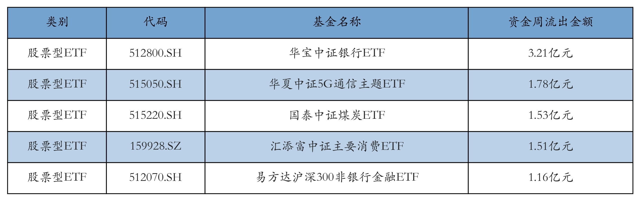 上周股票型ETF资金流出最多的5只ETF及其流出金额分别为:华宝中证银行ETF(流出3.21亿元)、华夏中证5G通信主题ETF(流出1.78亿元)、国泰中证煤炭ETF(流出1.53亿元)、汇添富中证主要消费ETF(流出1.51亿元)、易方达沪深300非银行金融ETF(流出1.16亿元)。详情见下表: