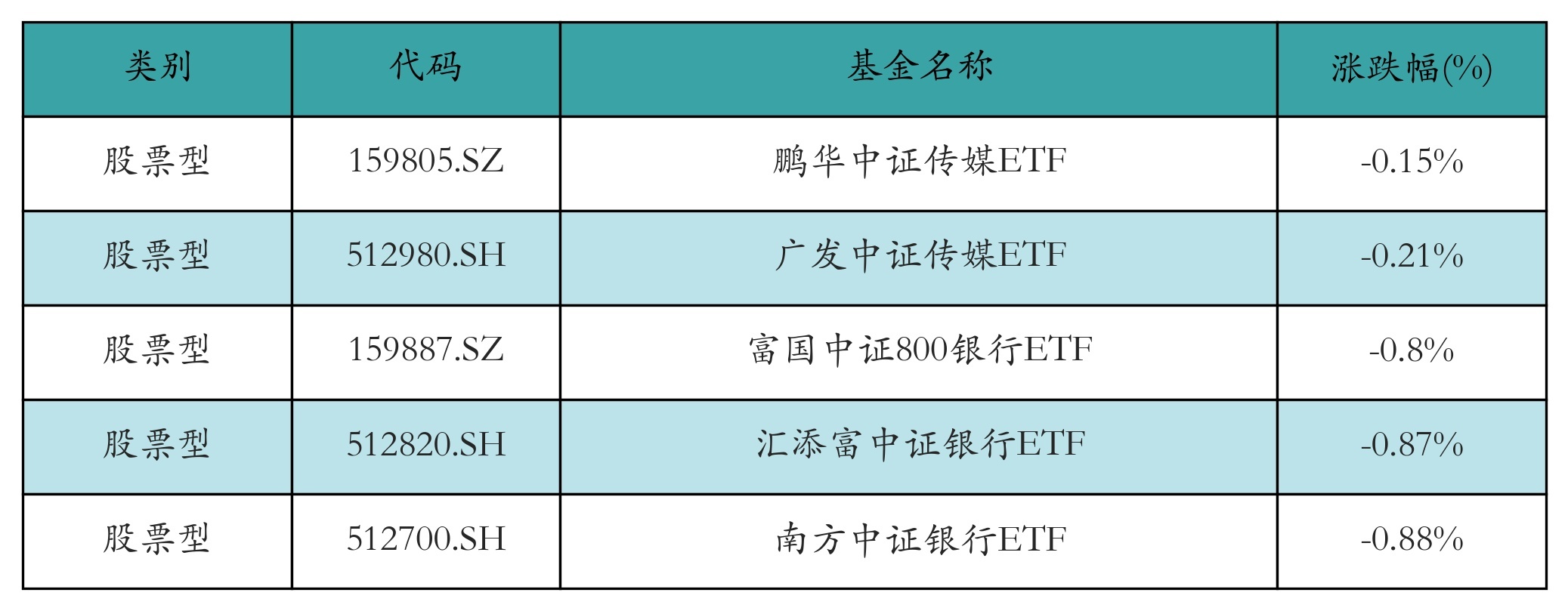 上周股票型ETF涨幅最高的5只ETF及其收益率分别为:鹏华中证传媒ETF(-0.15%)、广发中证传媒ETF(-0.21%)、富国中证800银行ETF(-0.8%)、汇添富中证银行ETF(-0.87%)、南方中证银行ETF(-0.88%)。详情见下表: