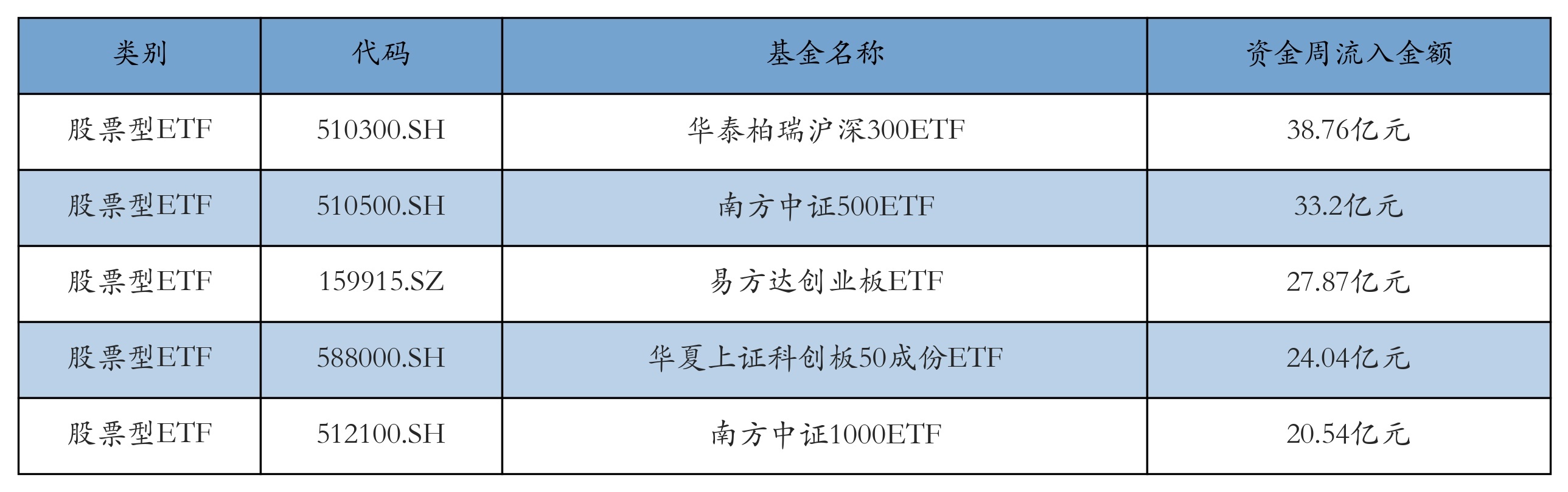 上周股票型ETF资金流入最多的5只ETF及其流入金额分别为:华泰柏瑞沪深300ETF(流入38.76亿元)、南方中证500ETF(流入33.2亿元)、易方达创业板ETF(流入27.87亿元)、华夏上证科创板50成份ETF(流入24.04亿元)、南方中证1000ETF(流入20.54亿元)。详情见下表: