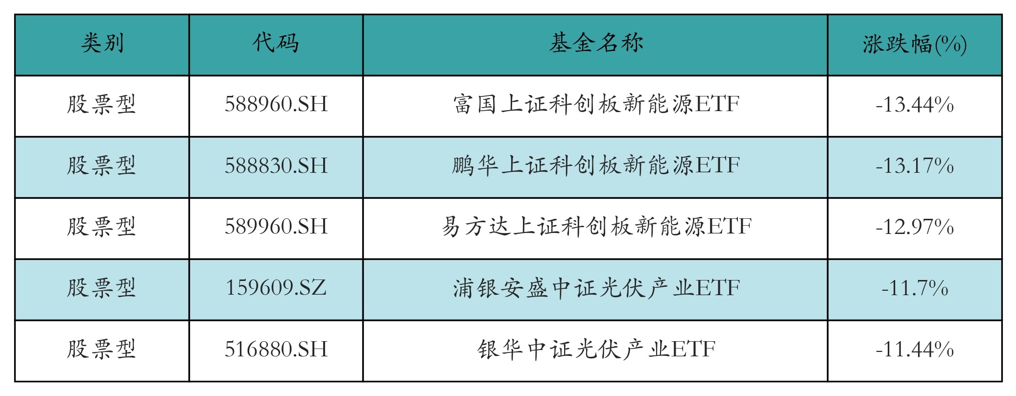 上周股票型ETF跌幅最大的5只ETF及其收益率分别为:富国上证科创板新能源ETF(-13.44%)、鹏华上证科创板新能源ETF(-13.17%)、易方达上证科创板新能源ETF(-12.97%)、浦银安盛中证光伏产业ETF(-11.7%)、银华中证光伏产业ETF(-11.44%)。详情见下表: